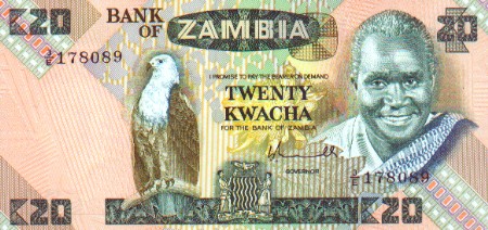 カウンダ元大統領の肖像が印刷されたクワチャ紙幣、もうないだろうね。クワチャとは夜明けという意味だったと思う。左の画像中段は見慣れない紙幣であることから1989年7月に移行した新札だろう。